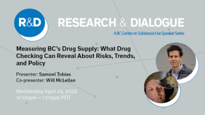 Join us in April for a webinar on Drug Checking in British Columbia. Drug checking services help individuals understand what’s in their drugs, but they can also reveal important patterns in the broader unregulated drug supply. We’ll explain the different sources of drug supply data with a focus on drug checking data and how it can be used to track changes in the drug market and improve our understanding of drug-related harms.